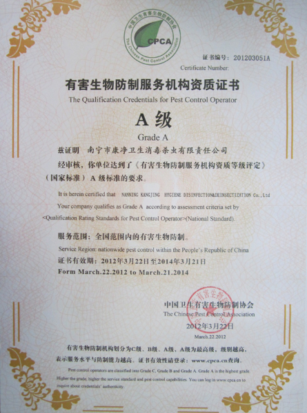 2012年3月21日-24日,中國衛(wèi)生有害生物防制協(xié)會2012年年會暨第四屆三次理事會在六朝古都南京市隆重召開,康凈公司被授予“中國有害生物防制服務(wù)機(jī)構(gòu)資質(zhì)A級證書”。年會是我國有害生物防制行業(yè)界最具規(guī)模與影響力的年度盛會,屆時,全國協(xié)會及會員單位、外國協(xié)會、省市地方協(xié)會(港臺協(xié)會)、愛衛(wèi)系統(tǒng)、疾控系統(tǒng)、科研院校、藥械生產(chǎn)與經(jīng)營企業(yè)、PCO企業(yè)等有關(guān)人士齊聚一堂,本次會議以“除四害與愛國衛(wèi)生運(yùn)動——紀(jì)念愛國衛(wèi)生運(yùn)動開展60周年”為主題,并對2011年通過A級資質(zhì)考評的全國10家PCO公司正式頒發(fā)資質(zhì)證書。圖為(中國衛(wèi)生有害生物防制協(xié)會)秘書長楊華林先生、(歐洲有害生物管理業(yè)協(xié)會)總干事Rob Fryatt 先生作報告,及頒發(fā)證書現(xiàn)場。