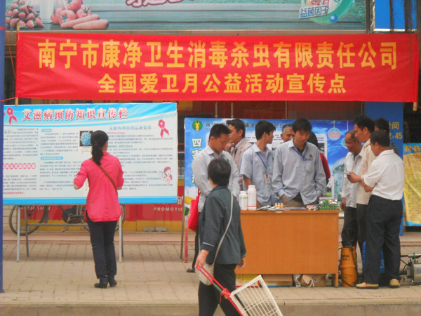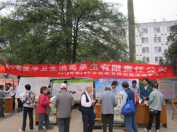 2012年4月6日在南寧市興寧區(qū)政府以及愛(ài)衛(wèi)辦的組織下,康凈公司兩個(gè)組分別在南寧市人民公園和科園西十路,開(kāi)展2012年第24個(gè)全國(guó)愛(ài)衛(wèi)月公益活動(dòng),圖為愛(ài)衛(wèi)辦領(lǐng)導(dǎo)小組到科園西十路活動(dòng)現(xiàn)場(chǎng)指導(dǎo),以及康凈公司專業(yè)技術(shù)人員在人民公園為廣大市民講解四害相關(guān)知識(shí)。